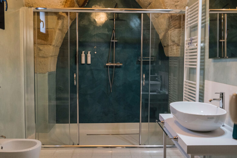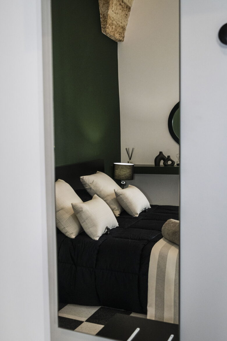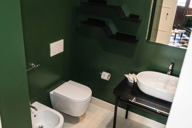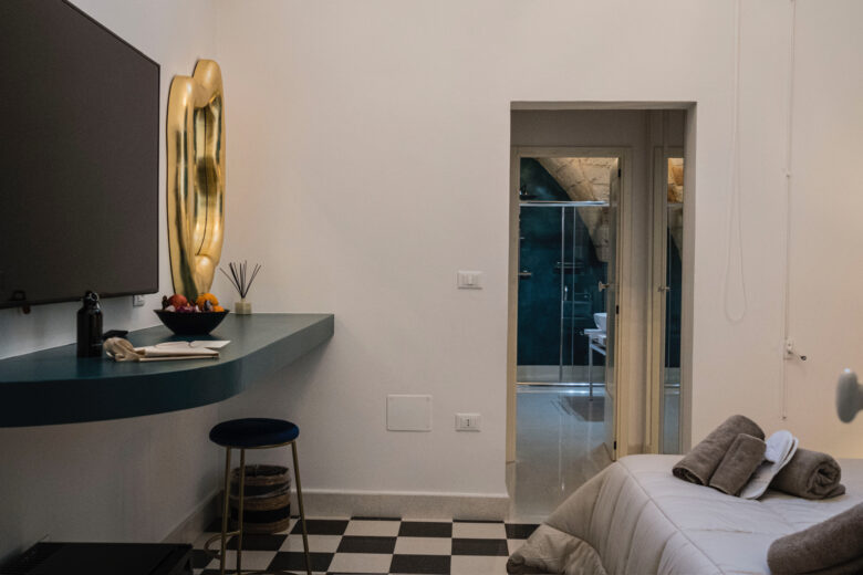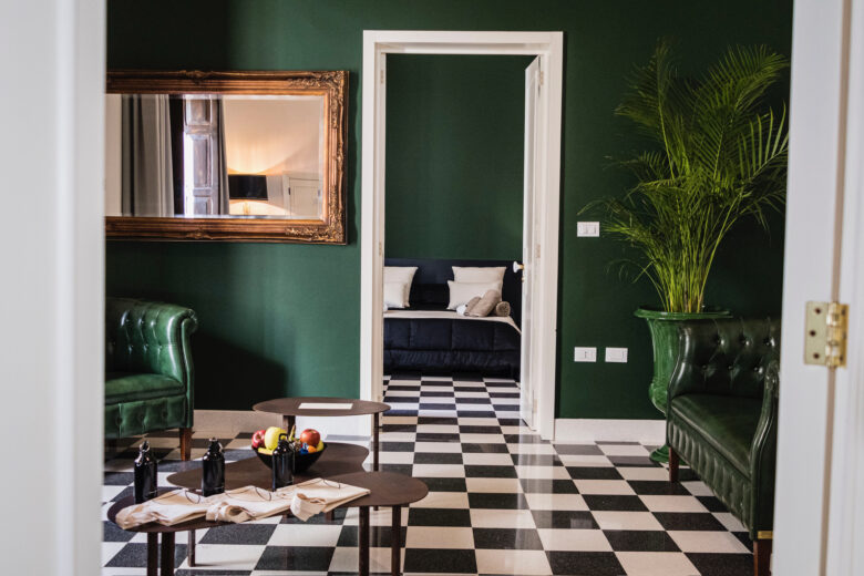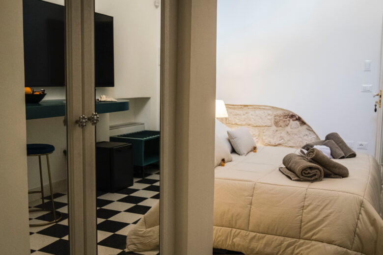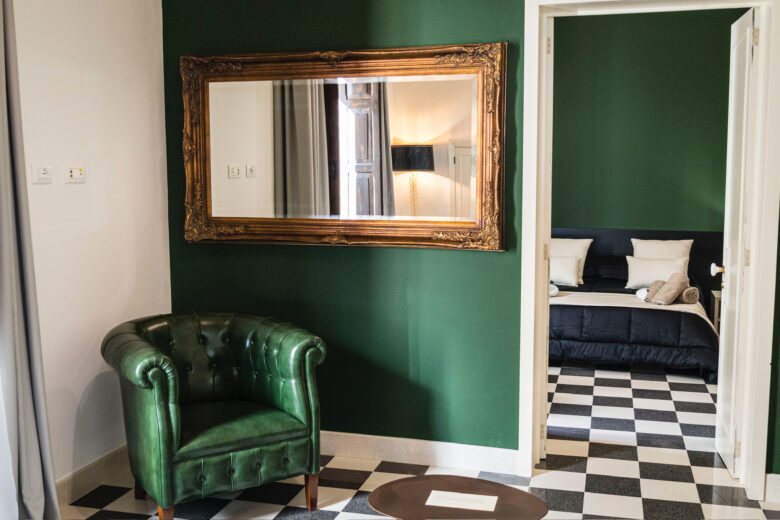 Thirty-five square meters of ample space and a chic, modern design with its checkered black and white flooring, offering old town views, fine Italian linens, robes and all the trinkets, mini bar, smart tv, security box, complete with products from Grown Alchemists in the private bathroom.